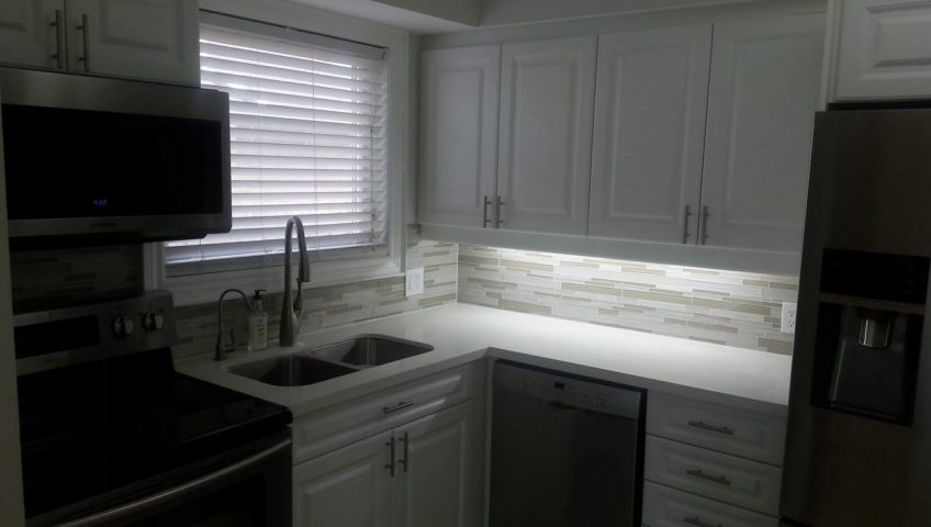 This project was completed for a long-time childhood friend who basically said “Here’s my budget, the property will be up for sale in 6 weeks, call me when you’re done.”  With that said, we went ahead and decided to do a complete gut of the kitchen and bathroom. We also removed all the carpet on the second floor and replaced it with all new laminate floors.  New oak handrails with new carpet on the stair treads were added to spruce up the staircase. We kept it clean and modest and brought some much-needed life into a once dull 3-bedroom, 1.5 bath home while keeping within the budget. We are pleased to say the house was SOLD and both the seller & buyer were pleased.