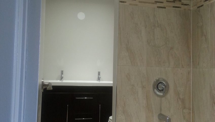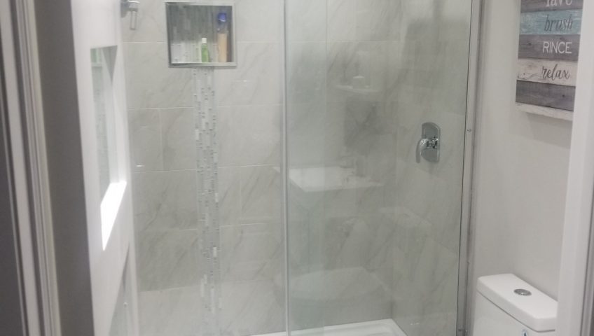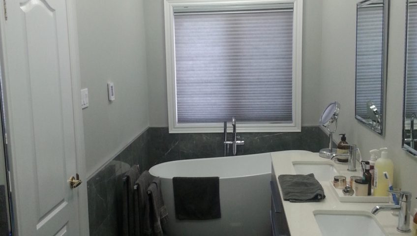 Our clients knew exactly the style, look and feel that they wanted for this one.  They had everything ready and waiting from the vanity, tub, tiles, toilet, fixtures and even the paint.  So, our job was easy! Well, maybe not so easy…but easier.   The heated floor, frameless shower glass and custom niches took it to the next level.  We enjoyed putting this one together