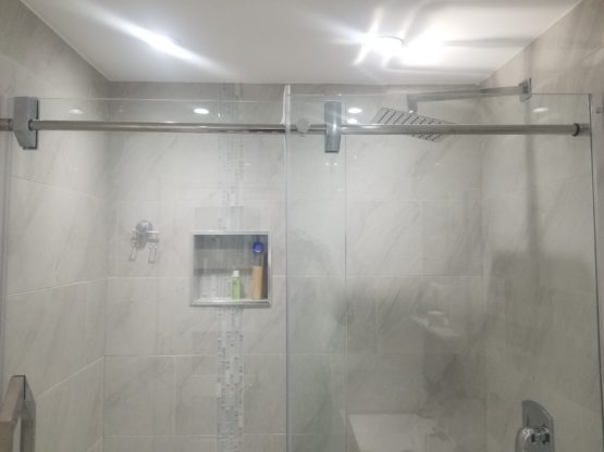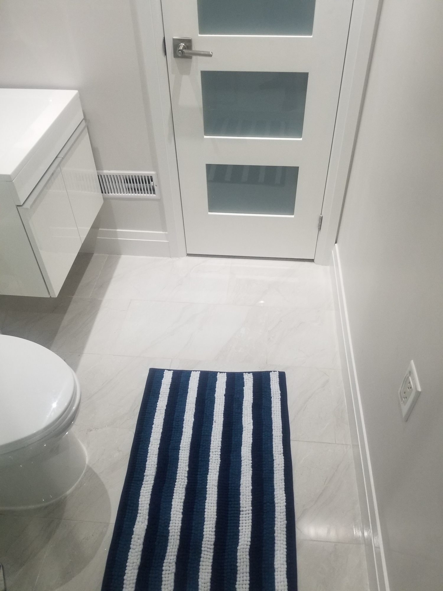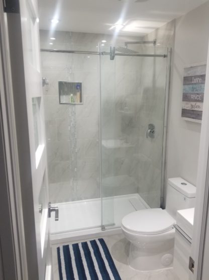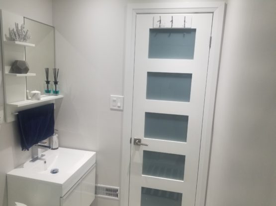 The husband decided to give wife/mother of 3 her own little oasis. So we transformed the basement into just that! We removed the existing wood panels, vinyl floors and dated light fixtures. We added a 3 piece bathroom, home gym, movie room and cladded the stairs with new oak treads and risers. The finishes we choose were simple but elegant. This space is a work in progress as there are plans in the future to add a wet bar as well as a laundry room upgrade. Perfect spot for some alone time!